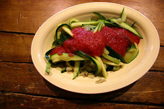 Cut zucchini into thin, noodle-like strips. Toss with salt, and place in a colander to drain for 30 minutes.